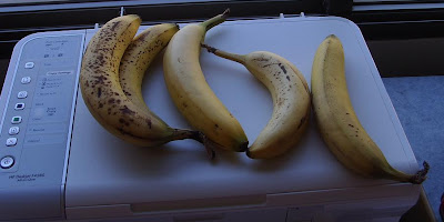 Above, banana-laden printer, bananas collected with the help of Kim next door.