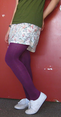 Above, Batman watch: Target. T-shirt: gift, Woot. Floral shorts: mother's. Tights: Nordstrom. White canvas shoes: Payless.