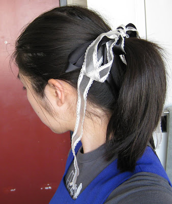 Above, hair ribbons: lying around + Forever21 skirt. T-shirt: Captain Awesome, Threadless. Dress: Goodwill. Gray tights: DKNY. Black patent leather flats: Steve Madden via Ross. Batman watch: Target.