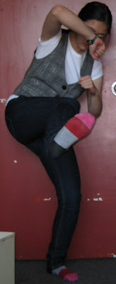 Above, plain white t-shirt: mother's. Vest: Esprit. Jeans: Forever21. Socks: dollar store.