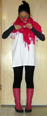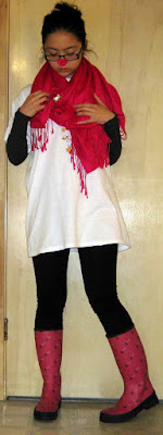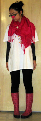 Above, fake pashmina: Chinatown, gift. Hello Kitty rhinestone pin: gift. T-shirt: uncle's. Leggings: delia's. Galoshes: J. Crew (outlet).