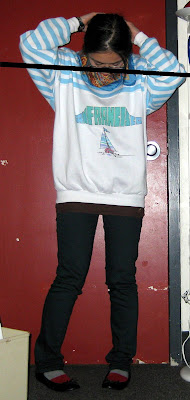 Above, brown thermal: Kohl's. Pink thing: made by my grandmother. Necklace: street vendor in New York. Jeans: Target. Shoes: plaid Keds.