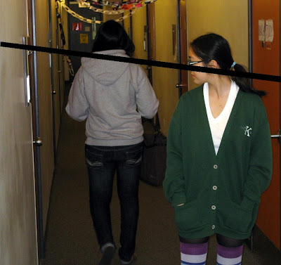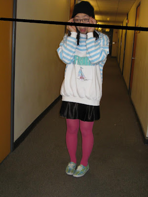 I will have more pictures of our hall's decorations soon, but here is what I was wearing because I didn't feel like putting pants on: