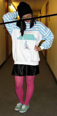 Above, beanie: H&M. Sweatshirt: Chinatown. Skirt: made by my grandmother. Tights: DKNY. Shoes: plaid Keds.