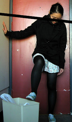 Above, black jacket: gift. Black scarf: New York Chinatown, gift. Floral shorts: mother's. Black tights: generic. Shoes: plaid Keds. Underthings I am about to flash you with: grandmother's.