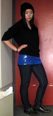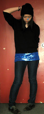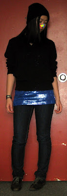 Above, beanie: H&M. V-neck sweater: Catholic school uniform. Sequined tank top: INC via Buffalo Exchange. Jeans: Forever21. Oxfords: Payless. Ring: Forever21. Filthy hair: priceless.