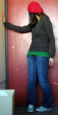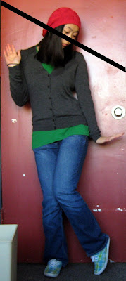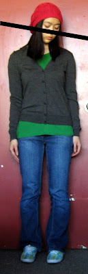 Above, pink beret: hat store in New York. Cardigan: Uniqlo. Green longsleeve: Target. Jeans: American Rag. Shoes: plaid Keds.