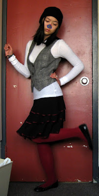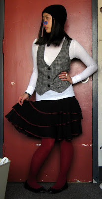 Above, angora/wool beanie: H&M. White thermal top: Old Navy. Vest: Esprit. Ring: Forever21. Tights: Forever21. Shoes: Steve Madden via Ross.