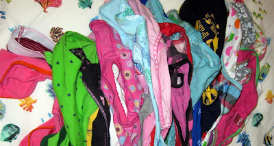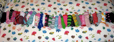 I cheated in this next picture because there are two pairs at the end (from Connie, from China, which means they're XL but would fit an infant) that I can't fit into, but still. Although... I guess it's saying something because I have fewer pairs than I thought I did. (Not counting the one I'm wearing and I think two washing/drying.)