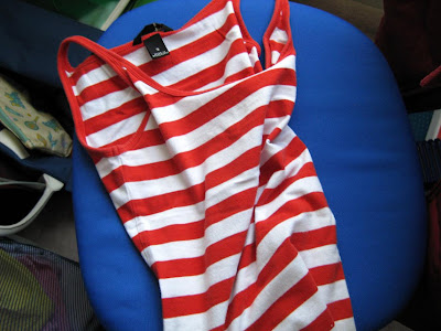 I thought I would be killing two birds with one stone by 1) being painfully hip and shredding a top and 2) making a small shirt into a medium because shredding expands the shirt. But no. Spandex is a cruel, cruel master. And shredding a striped shirt doesn't look that great. I'll shred it a lot more and see how it goes.