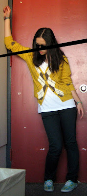 Above, fake Wayfarers: Forever21. White v-neck: Hanes via Target. Cardigan: Esprit. Jeans: Uniqlo. Shoes: Keds.