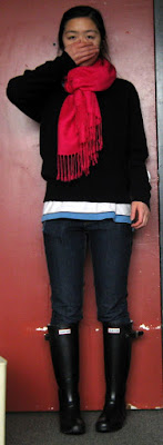 Above, scarf: New York street vendor. Sweater: K-8 uniform. Polo: American Eagle, brother's. Jeans: Forever21. Boots: Hunters.This (fake) pashmina is seriously fluorescent. It doesn't show in the pictures.