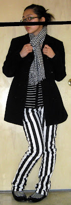 Above, scarf: Haight-Ashbury somewhere. White V-neck: Men's Hanes via Target. Cardigan: grandmother's. Pea coat: Kenneth Cole. Jeans: delia's. Socks: gift from yellow. Flats: Steve Madden via Ross. Red airplane pin: childhood.