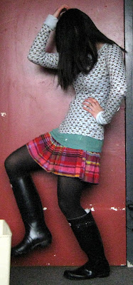 Above, printed thermal: Kohl's. Tank: Haight somewhere. Skirt: Nordstrom Rack. Tights: generic. Galoshes: Hunters via Zappos.