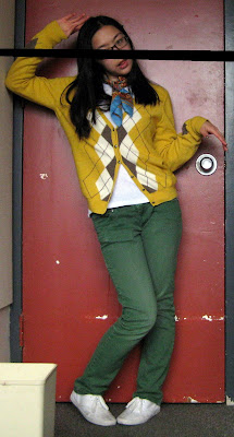 Above, cardigan: Esprit. Scarf: grandmother's. V-neck: men's Hanes. Jeans: Target. Shoes: Payless.