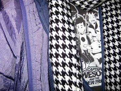 Above, jacket: mother's. Scarf: Haight somewhere. T-shirt: Threadless. Jeans: Levi's via Costco + DIY. Shoes: Fafi for Adidas.