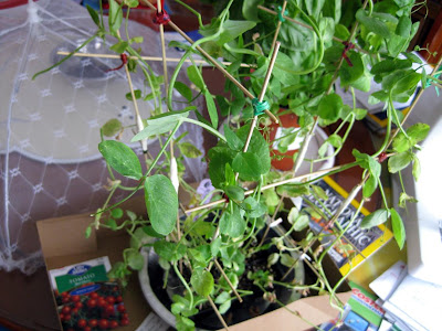 - Silly Eugenia! (Snow peas.) You are supposed to be intertwining with the ghetto barbecue skewer trellis, not my sewing machine! Also, Ernestine (sweet basil) was delicious (made the first cut yesterday). Actually, I'm pretty sure both Ernestine and Eugenia are on their way to dying, but... I believe.