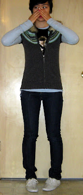 Above, thermal: gift, Old Navy. Sweater with drag queen fur collar: gift, Old Navy. Neville Longbottom t-shirt: Hot Topic. Jeans: Forever21. Shoes: Payless.