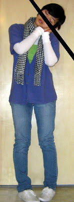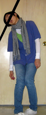 Above, scarf: Haight somewhere. White thermal: Old Navy. Green tank top: Old Navy. Sweater: secondhand, mother's. Jeans: Levi's via Costco + DIY. Shoes: Payless.