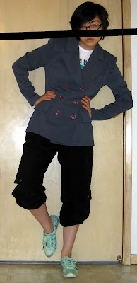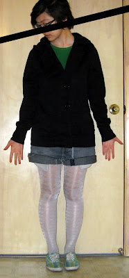 Above, green t-shirt: Old Navy, mother's. Jacket: gift. Shorts: secondhand Old Navy, brother's + DIY. Tights: H&M. Plaid shoes: Keds.