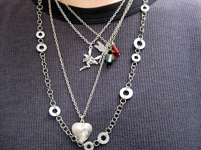 Above, top: secondhand Old Navy, brother's. Ring necklace: DIY. Locket: gift from Darlene. Fairy necklace: gift from Darlene. Dragonfly necklace: gift from yellow. Shorts: secondhand Old Navy, mother's + DIY. $1 Tights: H&M. Shoes: Steve Madden.