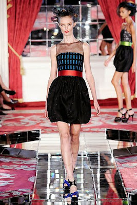 Above, from Monique Lhullier. So the hat looks ridiculous the way it's balanced on the model's head, but if I don't get my hands on something with sheer black sleeves so huge they could function as mosquito nets, I will forever be uncool.