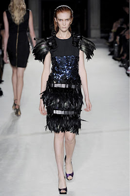 Above, from Roskanda Ilincic, because really, what is there to say? Feather epaulets, a sequined bodice, feathered skirt with little metal (or something) panels. Fierce as hell.