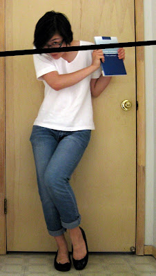 Above, subtle tee: DIY. Cuffed jeans: Levi's + Costco + DIY. Black patent leather flats: Steve Madden via Ross. Frantic gestures: no idea.