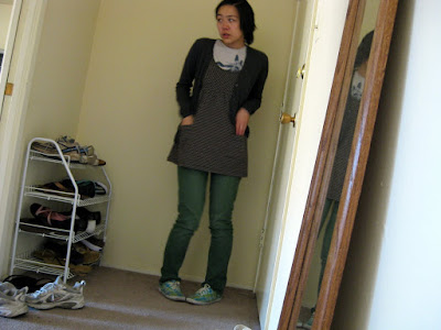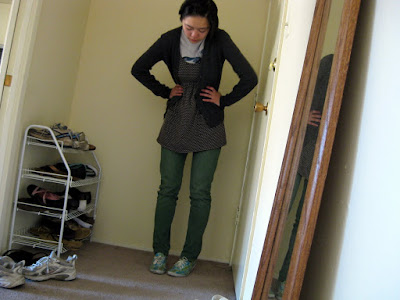 Above, cardigan: Uniqlo. T-shirt: Napoleon in War Paint, Threadless. Jumper: bloom. Green jeans: Target. Plaid shoes: Keds.