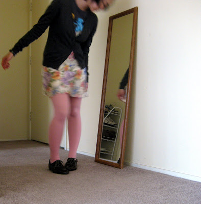Above, gray cardigan: Uniqlo. T-shirt: Threadless. Floral slip: secondhand. Tights: Nordstrom. Oxfords: Payless.