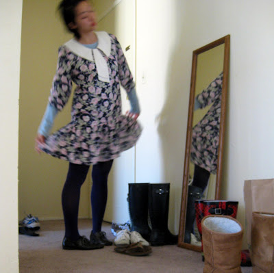 Above, dress: secondhand, aunt's. Lips: Wet 'n' Wild. Light pink thermal: Old Navy, gift. Gray tights: DKNY via Nordstrom. Socks: Nordstrom. White canvas shoes: Payless.THURSDAY: