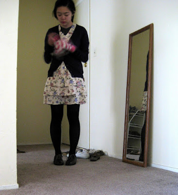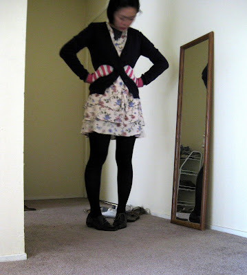 I wore this on Monday, which was oddly fortunate, because Extremely Blond Benjamin waved to me from across Lower Sproul, approached, and asked if I minded if he sat next to me to eat his lunch while he cut Economics, which he sees as a soul-crushing major. He then proceeded to offer me half of his crab sandwich, tell me my dress was "very pretty," advise me to follow my dreams, mention that he has trouble talking to girls, and admit that he wants to move to New York, change his name to Jean-Pierre, and live in a flat as a starving actor/artist, eating crap food for lack of income but buying expensive art instead.