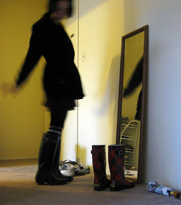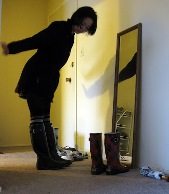 Above, black rain jacket: mother's. Maroon corduroy skirt: secondhand, gift, American Eagle. Black tights: generic. Over-the-knee striped socks: gift. Black rain boots: Hunter via Zappos.