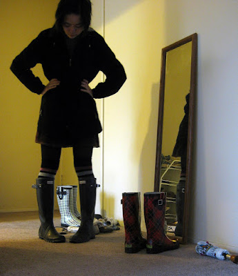 Unfortunately, most of my rain outfits look the same, owing to the fact that I have only one pair of rain boots and one rain jacket. My heart is filled with woe!