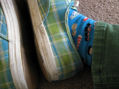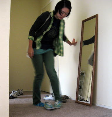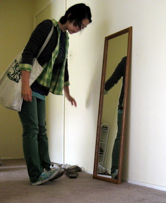 Above, Pigfarts t-shirt: Target + DIY silkscreen. Plaid shirt: secondhand, gift. Gray cardigan: Uniqlo. Whole Foods bag: Whole Foods, gift. Teal tank top: Haight somewhere. Green jeans: Target. Sushi socks: Hot Sox. Plaid shoes: Keds.