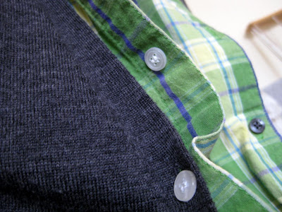 So I was having trouble figuring out how to stop my cardigan and plaid shirt from flapping about uselessly and shapelessly in the breeze and had the genius idea of buttoning them together, which worked flawlessly because it's a women's cardigan and a boy's shirt (so the buttons/buttonholes are on opposite sides).