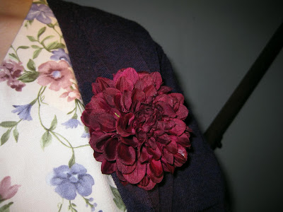 Above, cardigan: Uniqlo. Flower pin: fake flower from Beverly's + safety pin. White v-neck tee: Hanes via Target. Floral dress: secondhand, aunt's. Purple tights: Nordstrom. Silver oxfords: delia's.