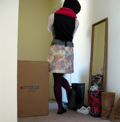Above, fake pashmina: New York street vendor. Vest: Nordstrom Rack. Pink thermal: Old Navy, gift. Floral slip: secondhand. Tights: BP Nordstrom. Oxfords: Payless.