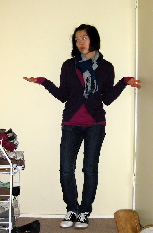 Pseudo-Ravenclaw scarf: gift. Violet cardigan: Uniqlo. Pink v-neck sweater: Target. Skinny jeans: Forever21. Black and white saddle shoes: Payless. Rings: estate sale, Forever21.
