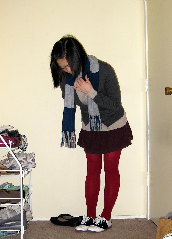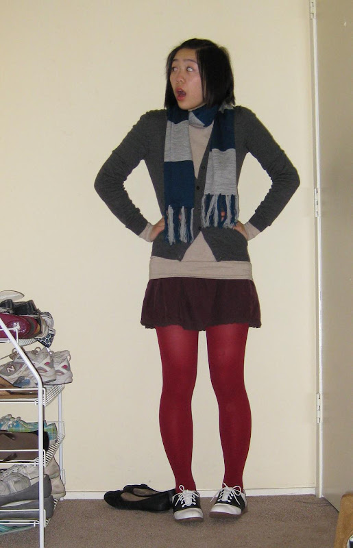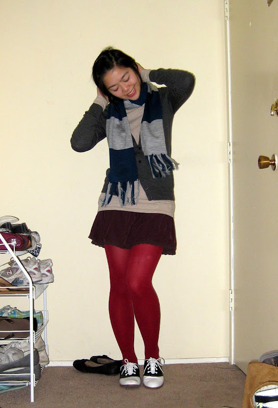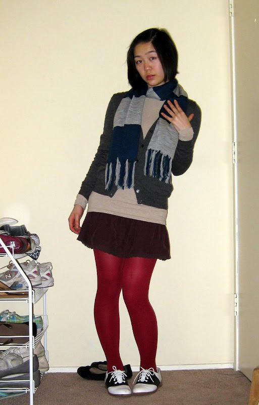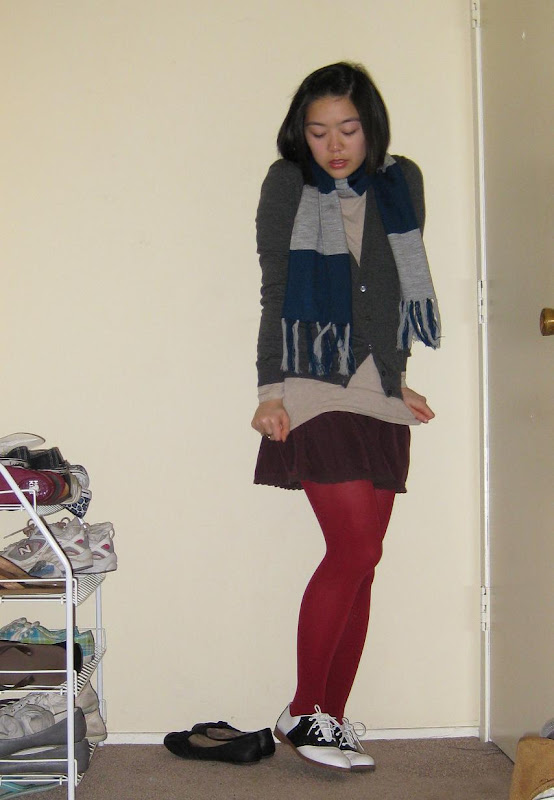 Scarf: gift. Gray cardigan: Uniqlo. T-shirt: Apt 9. Maroon corduroy skirt: American Eagle, secondhand. Tights: Forever21. Saddle shoes: Payless. Rings: secondhand.
