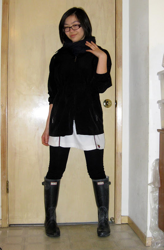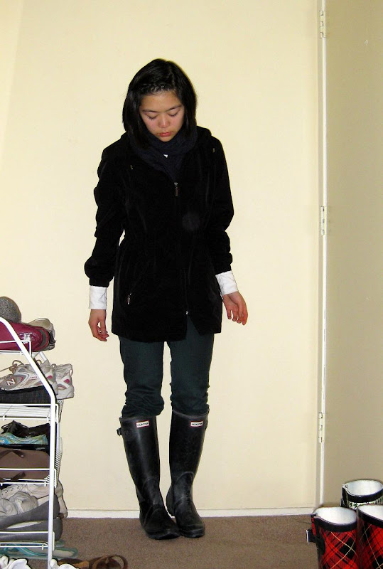 Thermal: Target. Scarf: Old Navy. Jeans: Uniqlo. Jacket: mother's. Galoshes: Hunter.