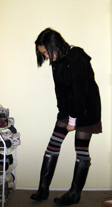Scarf: Chinatown. Skirt: secondhand American Eagle, gift. Tights: generic. Socks: Target. Jacket: mother's. Galoshes: Hunter.