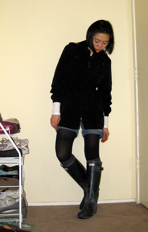 Thermal: Old Navy, gift. Denim shorts: mother's, Old Navy + scissors. Black tights: generic. Socks: Target. Jacket: mother's. Galoshes: Hunter.