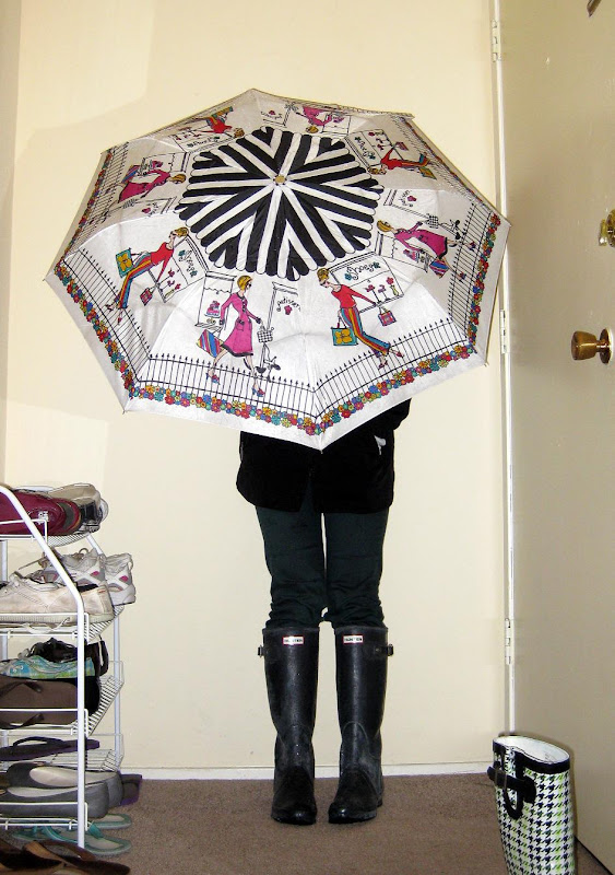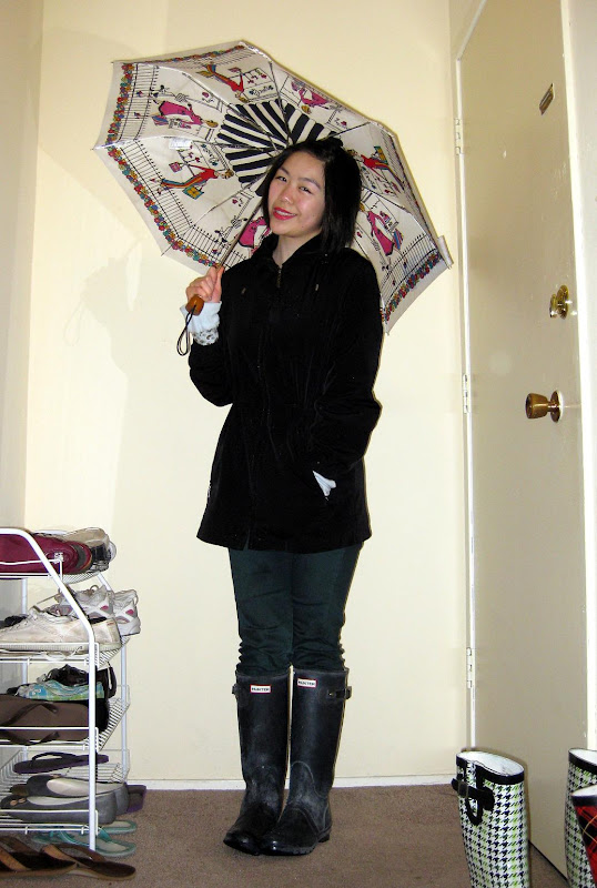 I hide behind my umbrella of shame. Thermal: JC Penney. Jeans: Uniqlo. Jacket: mother's. Galoshes: Hunter.