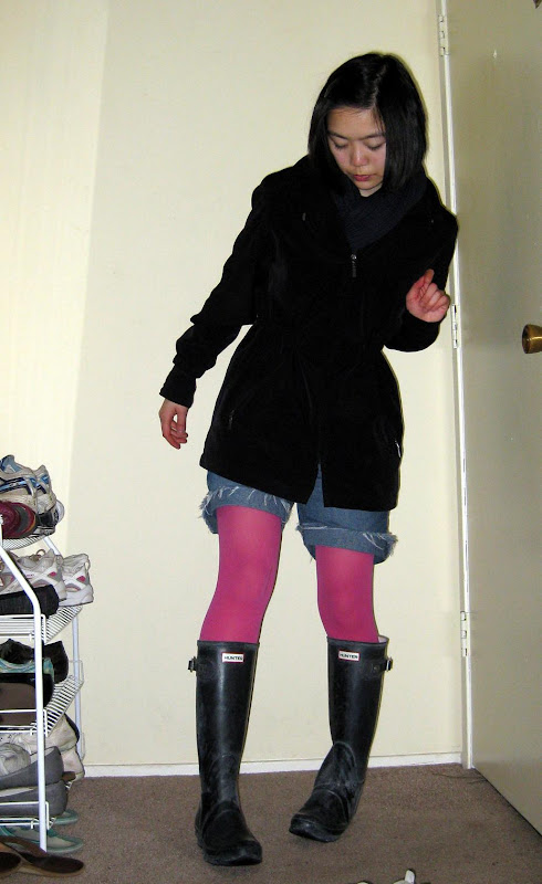 Thermal: Target. Scarf: Old Navy. Denim shorts: mother's, Old Navy + scissors. Hot pink tights: DKNY. Jacket: mother's. Galoshes: Hunter.