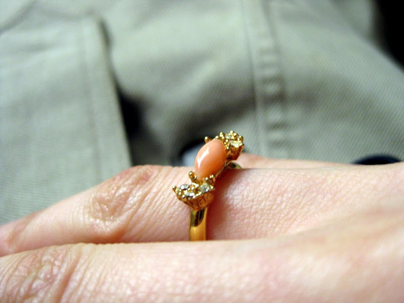 Trench coat: FoxRun, hand-me-down. Silk scarf: grandmother's. Rings: secondhand, estate sale. Light gray argyle tights: H&M sale. Black and white saddle shoes: Payless.