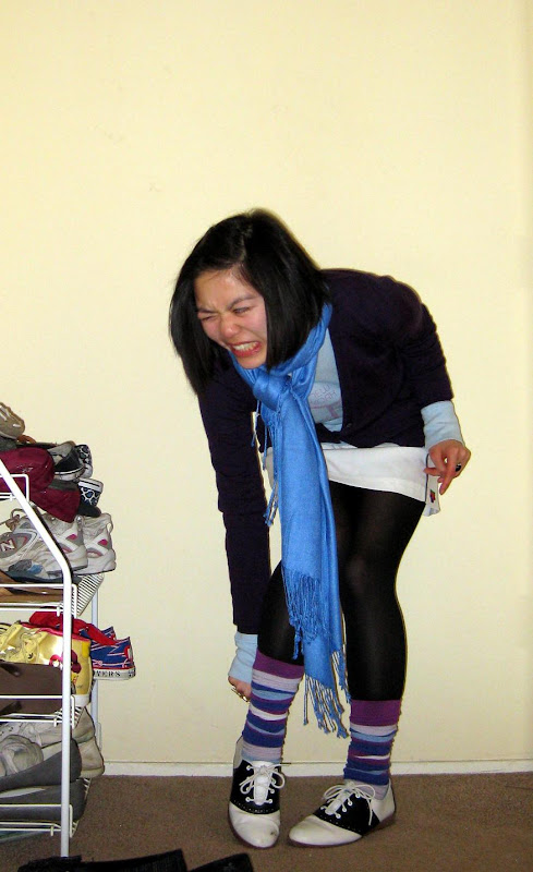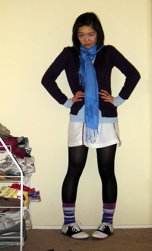 Violet cardigan: Uniqlo. Light blue thermal: Old Navy, gift. Blue fake pashmina: gift. Miniscule tennis skirt: thrifted. Black tights: generic. Striped socks: gift. Black and white saddle shoes: Payless.