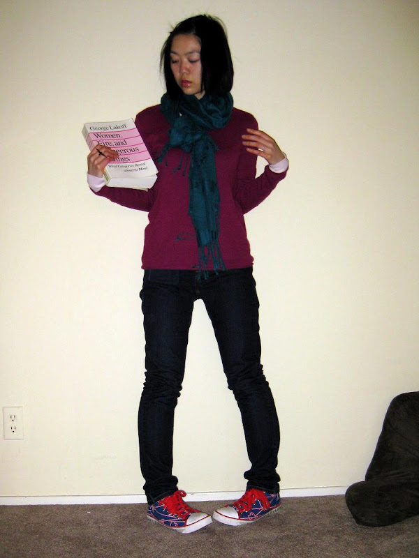 White thermal: Old Navy. Pink v-neck sweater: Target. Teal fake pashmina: Chinatown, gift. Skinny jeans: Levi's 518. Canvas sneakers: Harajuku Lovers.