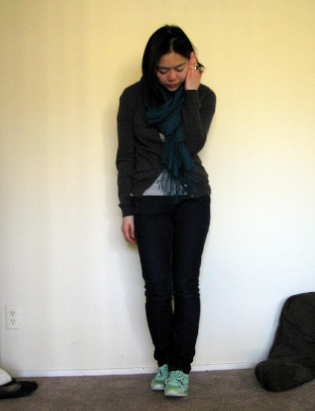 Shoes: Fafi for Adidas. T-shirt: Cal Student Store. Cardigan: Uniqlo. Jeans: Levi's. Pashmina: gift. Rings: estate sale.