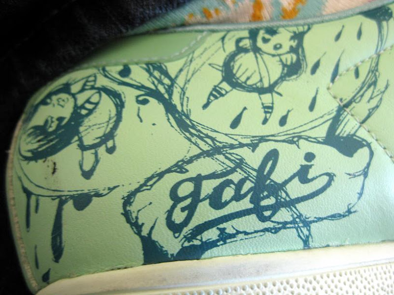 Lest the post title deceive you, I assure you that as someone who considers walking through campus to get to class to be vigorous exercise, I have no desire or use for real athletic shoes. Instead, I have these rather aesthetically pleasing Fafi for Adidas shoes (with closeups this time) that are a half-size too small and which I bought for $25 from some guy selling Adidas samples out of his garage. I am not lying. See the tongue of my yellow high-tops ($35) for proof: